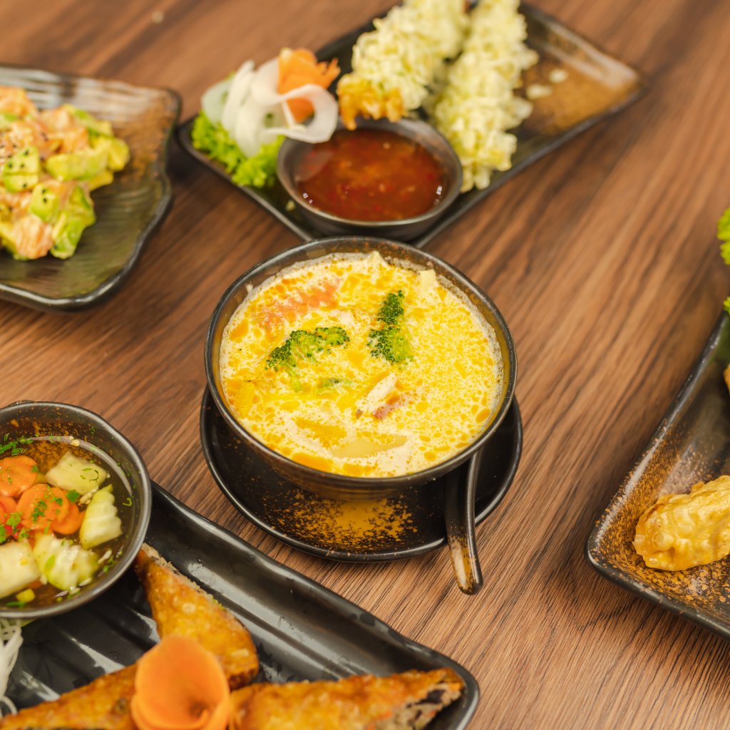 thajská polévka s kokosovým mlékem, kuřecím masem, zeleninou a bylinkami.
